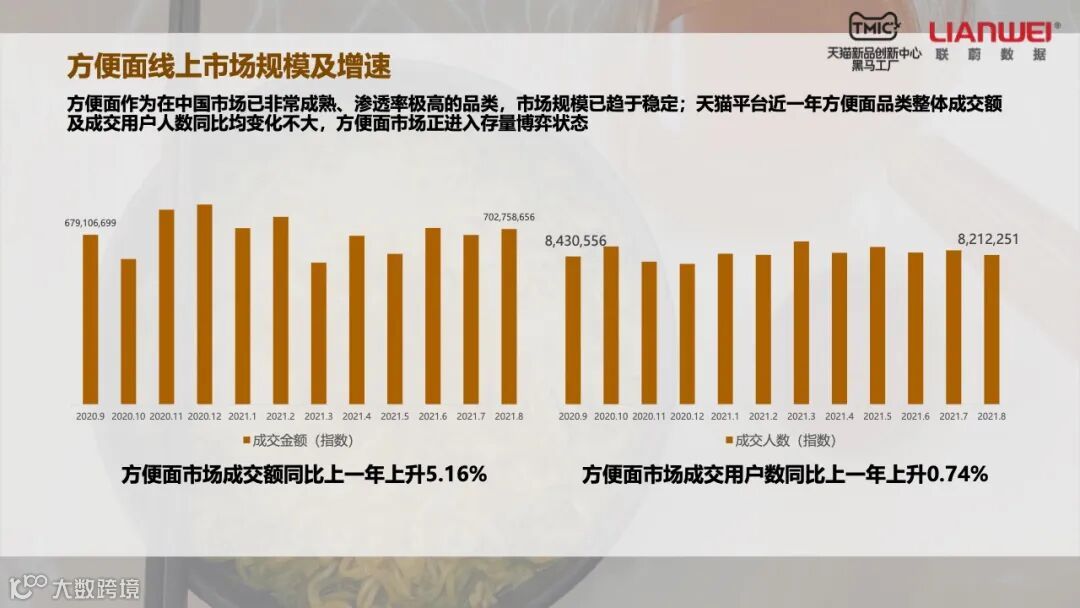 天猫平台数据显示,截至2021年8月,方便面成交额同比上一年增加5.16%,成交用户数比上一年增加0.74%。与新行业、新品类相比,方便面行业增幅不高,凸显市场趋于稳定,进入存量博弈状态。特别是在外卖、预制菜等替代选择挤压下,传统中低价方便面成交额降幅较明显。以每袋11元为界,低于这一价格的方便面成交额同比下降13%;超过这一价格的方便面成交额同比增长14%。