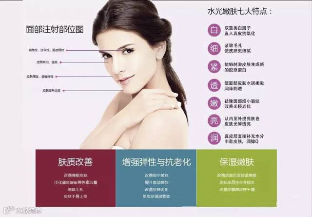 水光焕颜,就是将透明质酸、胶原蛋白等营养成分直接注入到真皮层,使皮肤充满水分,改善皱纹、肤色、肤质,达到恢复皮肤弹性及美白提升的作用,从而起到抗衰老及改善各大问题肌肤的功效。