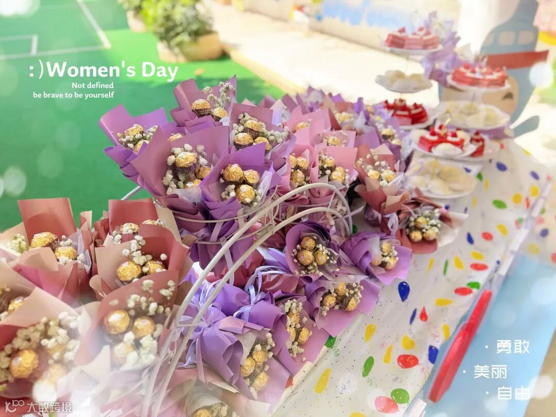 广船二幼筹备了一场温馨而浪漫的庆祝活动。精致的甜品塔、点缀着满天星花束,为女职工们送上满满的甜蜜暴击。女职工们手持金莎花束,在镜头前留下最美的笑颜。