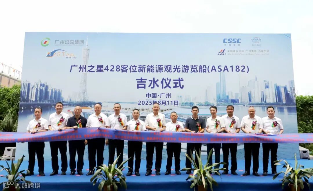 8月11日,由中船集团第六〇五研究院设计、英辉南方造船(广州番禺)有限公司为广州之星游轮有限公司建造的428客位新能源观光游览船“星舰领航”下水仪式在南沙举行。该船是广州首艘应用3D全息投影技术呈现多元化外观造型的新能源游览船,将服务于珠江夜游观光。中船集团广州公司党委副书记、总经理王学军,中船远舟董事长韩兵,中船集团六〇五院副院长孙铁锐,广州市公共交通集团有限公司副总经理刘伟,广州公交集团客轮有限公司党委书记、执行董事范献刚,广州之星游轮有限公司总经理欧宗勇,英辉造船总经理陈晓亮,广州鑫泽船舶技术有限公司总经理邓卫建等出席仪式。