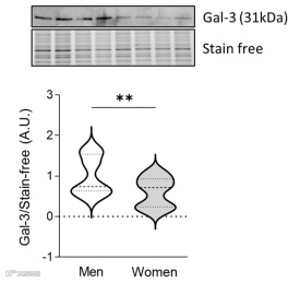 研究人员分析了226名接受手术 AV 置换的严重主动脉瓣狭窄患者(139名男性和87名女性)心脏主动脉瓣样品,以确认 Gal-3 与相关机制标志物(如炎症、钙化和血管形成)的关联。结果表明:Gal-3 在男性 AV 中的表达量高于女性,且 Gal-3 水平与男性和女性的炎症标志物相关,而它们主要与男性的成骨标志物相关,仅与男性的血管生成标志物相关。用 Gal-3 处理瓣膜间质细胞后,两性细胞的炎症和成骨分子水平都会增加,但仅在男性细胞中血管生成标记物的水平会增加。Gal-3 的药理抑制可阻止 VIC 中这些病理标志物的增加。