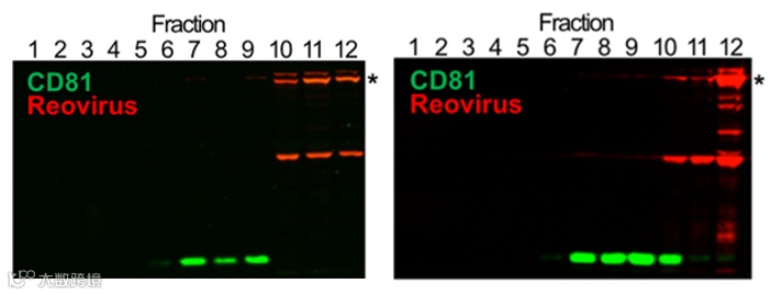 为实现EV跨膜marker CD81和正呼肠孤病毒marker的同时检测,范德比尔特大学医学中心的研究者也使用了多色荧光WB技术来设计实验(参考文献2)。IRDye800和IRDye680两种不同荧光染料标记的抗体用于不同靶蛋白的检测(如下图)。