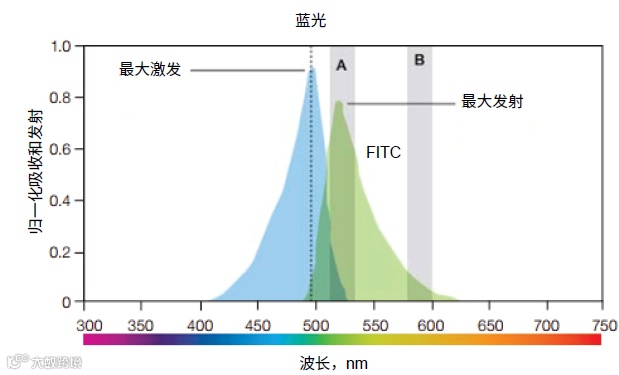 在激发光的峰值处称为最大激发波长,在该波长可以激发出最强的荧光;在发射光的峰值称为最大发射波长,在该波长可以收集到最强的荧光信号。例如FITC染料,通常使用接近FITC的490nm吸收峰的488nm蓝色激光来激发该荧光团。FITC发出475nm至650nm的荧光,在525nm处达到峰值,落在绿色光谱内。