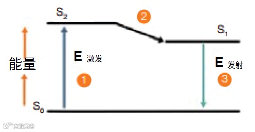 细胞上标记的荧光染料在流式细胞仪中被激光激发,而激发和发射的过程都伴随着能量的改变。当荧光团吸收光时,其电子会被激发,并从静止状态(S0,图1)跃迁到最大能级,称为激发电子单重态(S2)。对于每个荧光团,此转换所需的能量不同。激发态的持续时间取决于荧光染料,通常持续1-10ns。然后,荧光染料发生构象变化,电子下降到称为电子单重态(S1)的更低、更稳定的能级,在此过程中一部分吸收的能量作为热量被释放。电子随后回到其静止状态(S0),释放出剩余的能量(E发射)作为荧光。对于单个荧光团,此循环可以重复数千次,从而可以回收荧光团,进而放大信号。