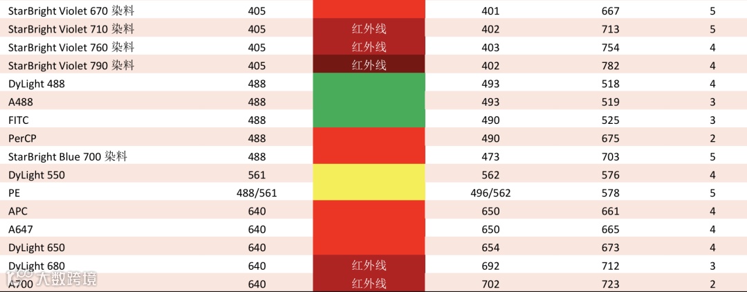 由于激发荧光染料的能量比其发射出的光的能量高,所以任何荧光染料的发射波长都比其激发波长更长,因此可对应于电磁光谱上不同的颜色。