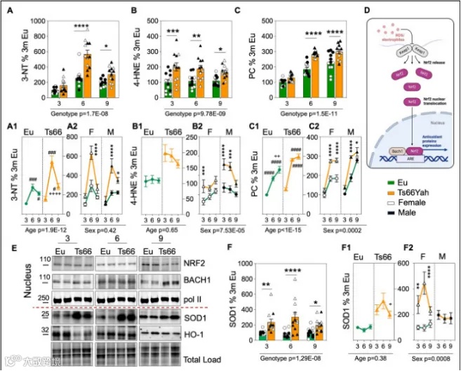 在最新发表在神经领域一区 Neurobiology of disease 的创新性研究中,研究者基于行为学分析并结合大量 WB 实验(利用 Stain-Free 免染总蛋白作为 WB 内参),表明 Ts66Yah(唐氏综合征)小鼠模型中,随着年龄的增长,氧化还原平衡、蛋白质平衡、应激反应、代谢通路、程序性细胞死亡和突触可塑性的调控变化,为理解衰老相关的脑疾病提供新的理论基础[1]。