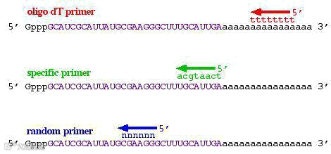 多个任意的碱基连接而成的一套寡聚引物组,适合各种RNA的逆转录,包括mRNA,rRNA,tRNA均可以作为模板,尤其适合模板丰度很低的情况。当目标区域具有复杂二级结构或GC含量较高,或者模板为原核生物来源,可使用随机引物。但缺点在于,结合的随机性会造成cDNA小片段较多,非目标基因cDNA太多,有时候还会对微量目的片段造成稀释,可能会影响低丰度基因扩增。