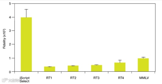 此外,与其他几种常用逆转录酶相比,iScript Select Kit 表现出卓越的保真度。使用六种不同的常用逆转录酶之一逆转录氨苄青霉素抗性基因的部分片段。使用Bio-Rad的iProof™ High-Fidelity Master Mix进行PCR。利用Illumina MiSeq平台对产生的扩增子进行测序。对于每个样本,获得了1000万个具有三个或更多重复的有效读取碱基。通过取错误率的倒数来确定每种逆转录酶的保真度。四次重复的平均准确度为最终结果。