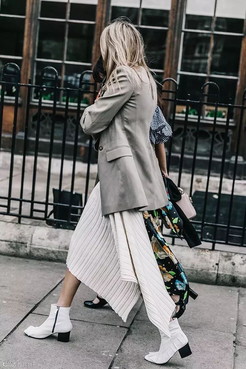 这种不规则百褶裙搭配西装外套,让整体穿搭有了更多的层次感,时髦感瞬间UP UP UP!