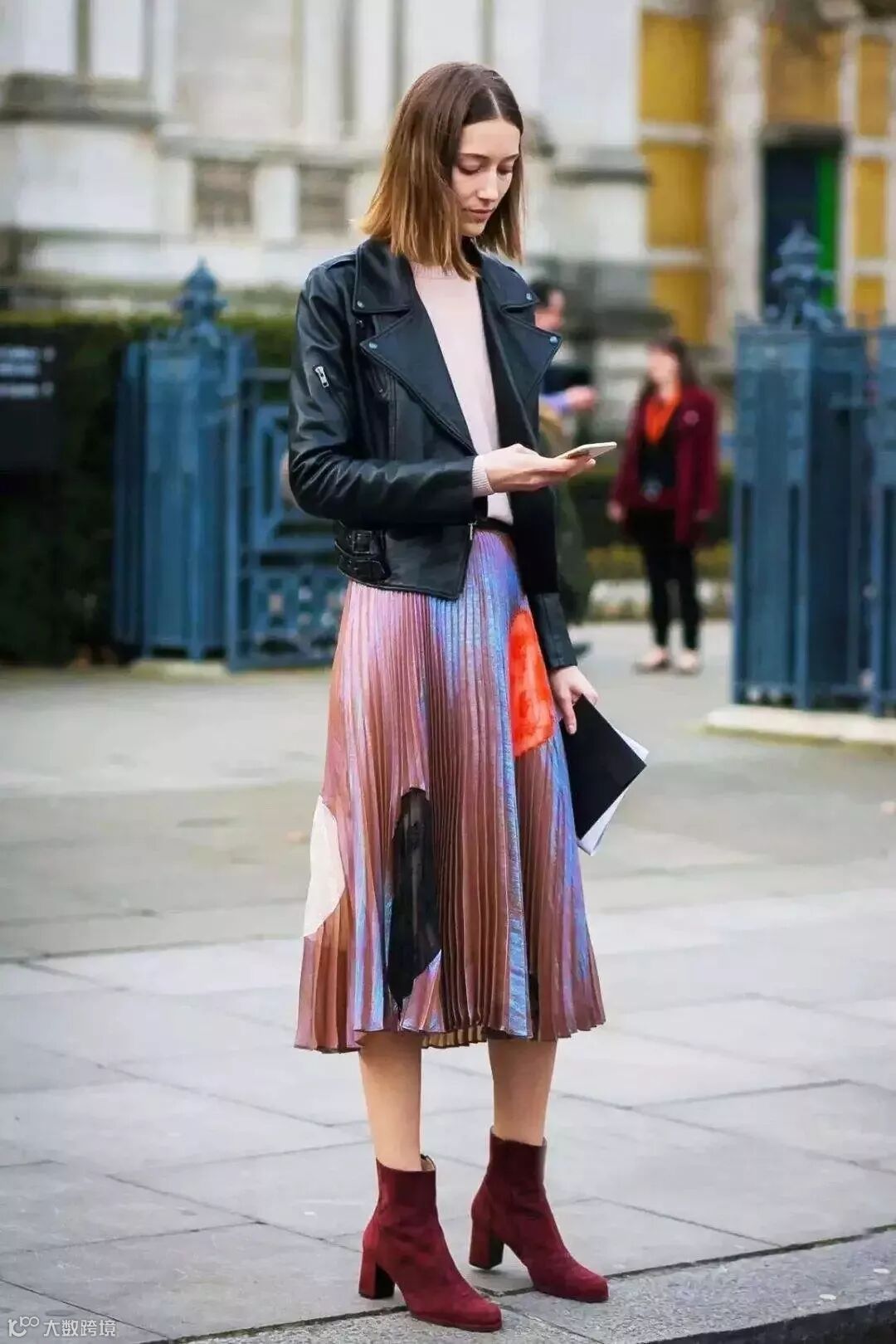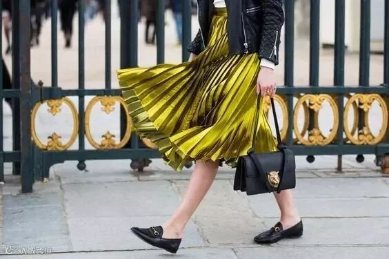 “上短下长”、“上紧下松”的法则在百褶裙的穿搭中同样适用,搭配皮衣真的立马气场高两米!