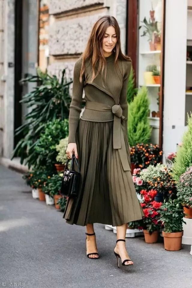 王牌换季针织衫必须拥有姓名!腰带、刚好盖臀长的针织衫+百褶裙搭配,一方面遮住胯宽,另一方面从视觉上修饰腰臀比,以达到好的修身效果。