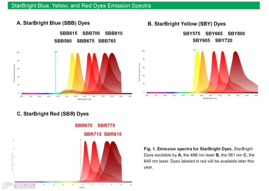 1.StarBright 星光染料激发和发射波段窄,有多种选择包括紫外激发、紫光激发、蓝色激发,黄色激发和红光激发。