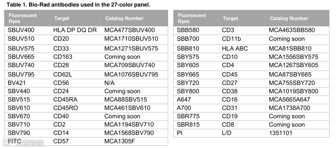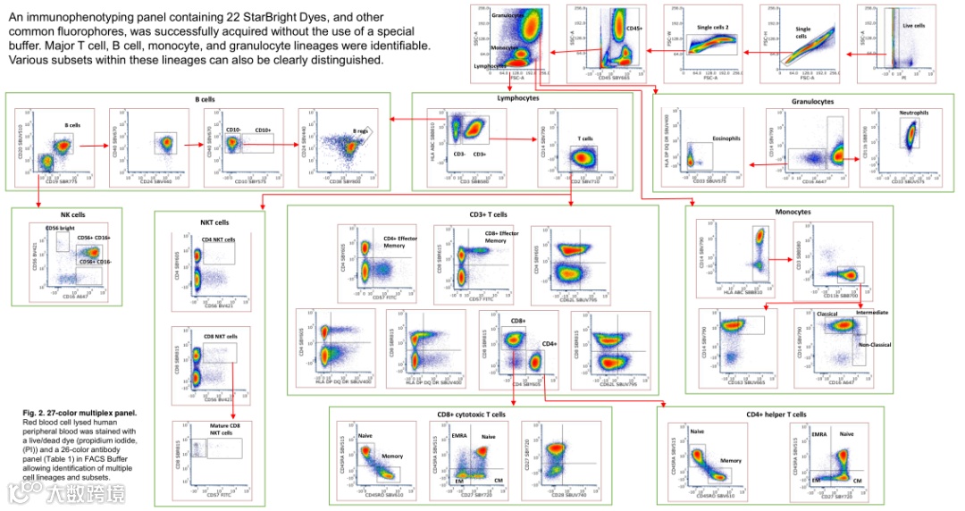27⾊免疫表型分析方案中,同时包含紫外、紫⾊、蓝⾊、⻩⾊和红⾊激发的 StarBright 染料偶联抗体。