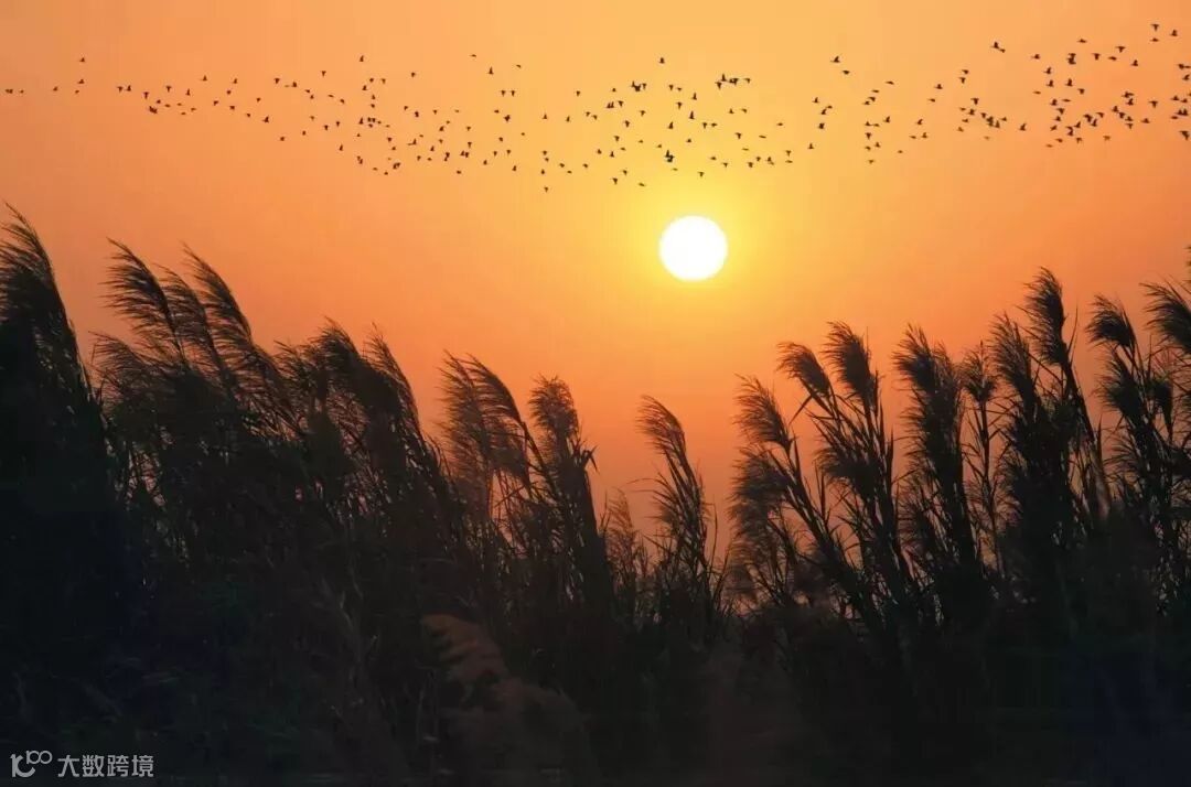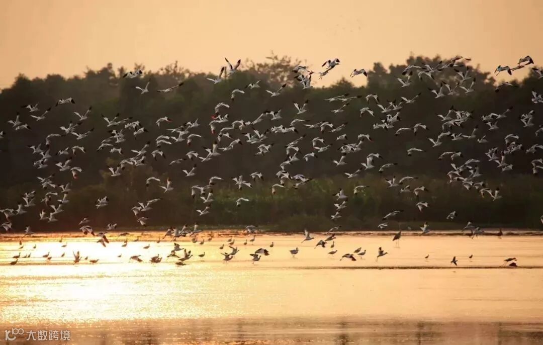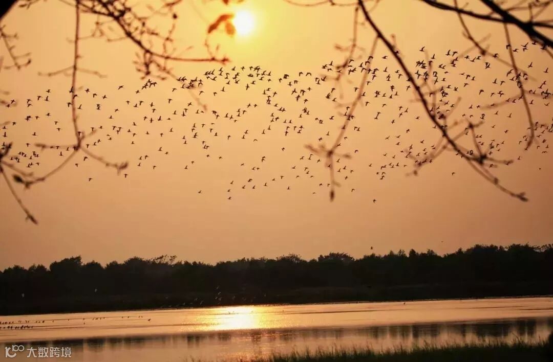 夕阳西下,鸟岛上鹭鸟群飞的镜头