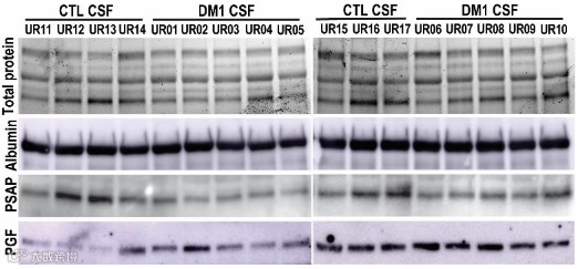 研究人员通过小鼠模型确定了脉络丛上皮细胞特别受有毒 CUG 扩增 RNA 表达的影响。为测试脉络丛转录组改变同样也会导致患病人类脑脊液(CSF)成分改变,研究者通过腰椎穿刺从 1 型强直性肌营养不良症患者(5 名女性,5 名男性)和非强直性肌营养不良症患者(3 名女性,4 名男性)处获取 CSF并通过蛋白质印迹分析脑脊液成分改变。