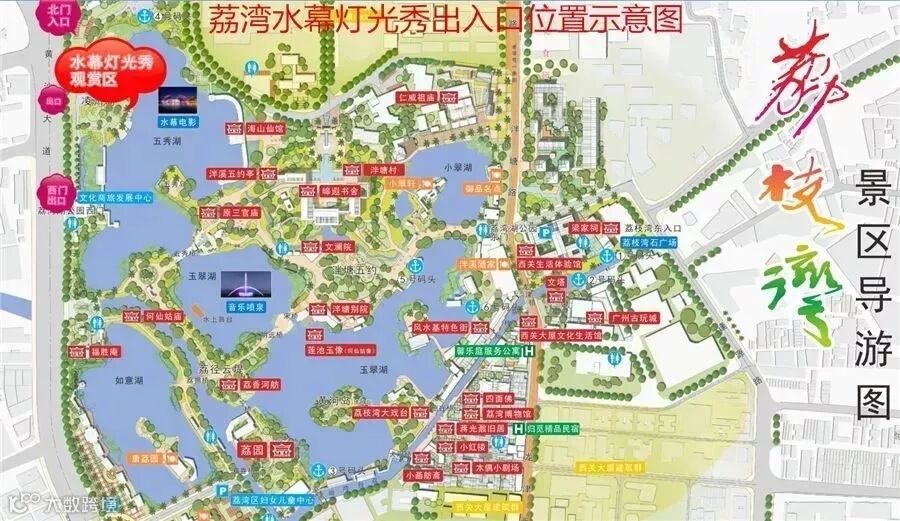 · 地点:荔湾区荔湾湖公园。具体展演位置在五秀湖,最佳观赏区域在凌州岛,园区入口设在公园北门(中山八路197号),出口设在公园西门和凌州岛。