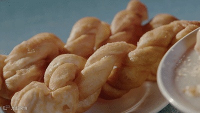 麻花被油茶泡到绵软,吃起来外软内筋。