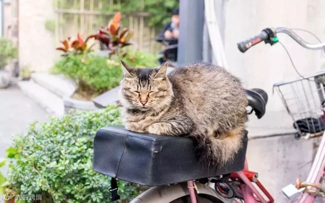 猫咪在旧自行车旁边打闹、睡觉
