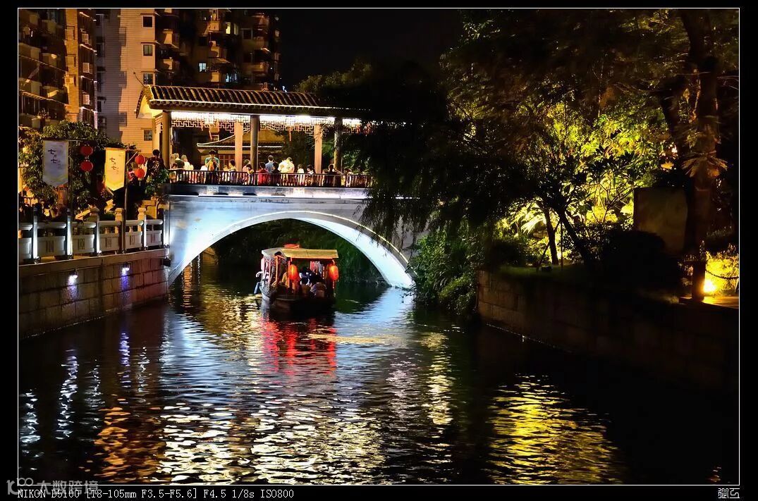 在晚上的时候,桥的两旁更是亮起灯光,坐在凉亭里吹着风,是一件多惬意的事情,当看到晚上游人在这里散步的时候,不禁猜想当年的西关小姐和东山少爷也是这样依偎着散步的吧。