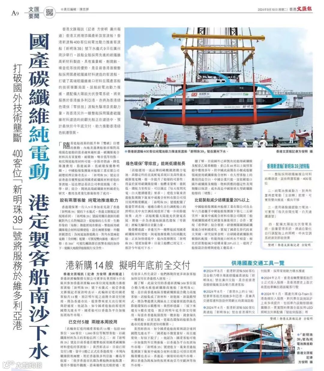 近日,中国香港新渡轮400客位纯电池动力推进客渡船“新明珠39”下水仪式在广州南沙举行。此次下水仪式邀请了科技日报、中国科学报、南方日报、广东广播电视台、羊城晚报、广州日报、广州广播电视台、大公报、《南方》杂志等多家主流媒体到现场进行采访并报道。随后,人民网、新华网、中国青年网、光明网、环球时报、东南网、观察者网、台海网、东方财富网、网易新闻等媒体进行大量转发。