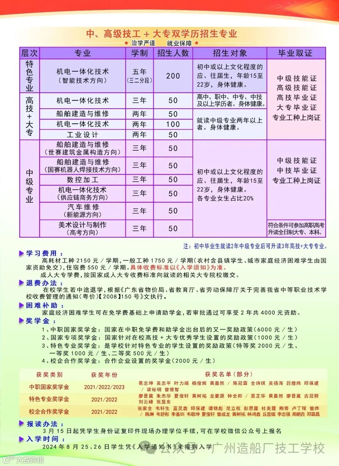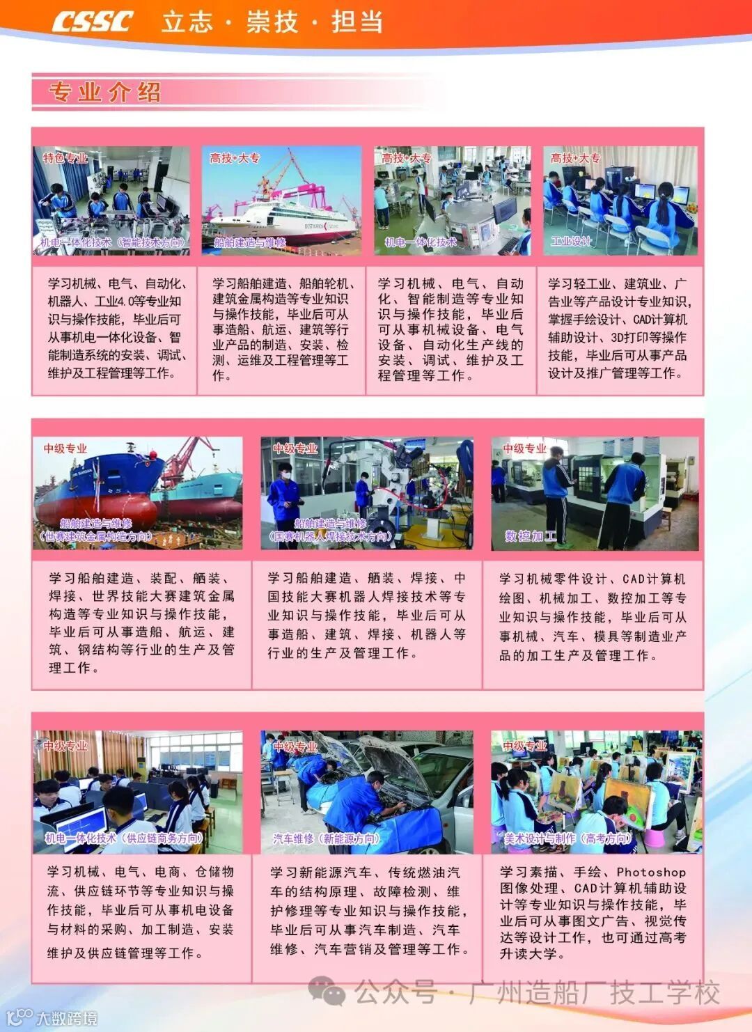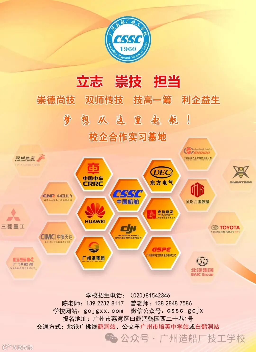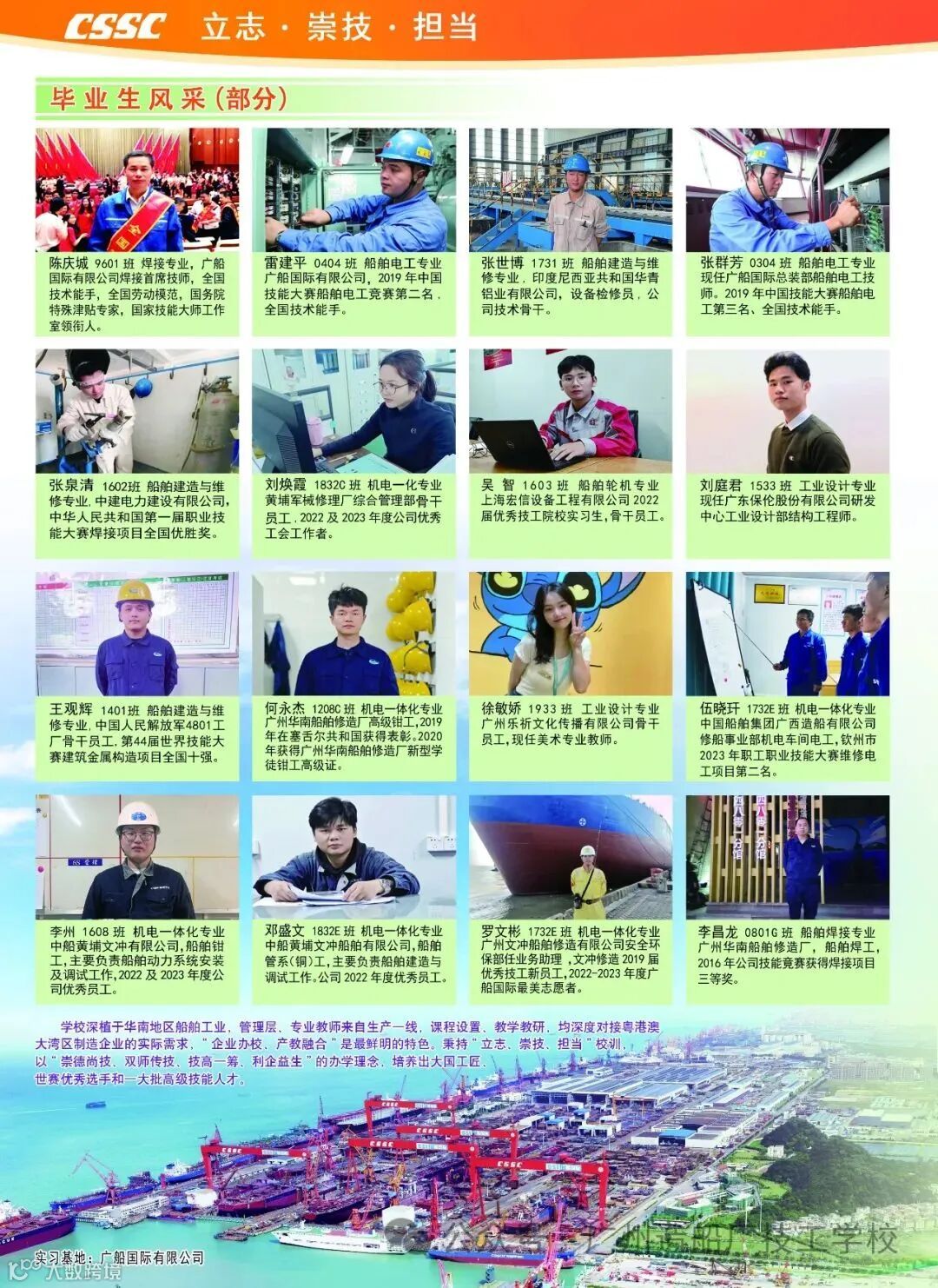 广州造船厂技工学校(简称广船技校)是一所公办技校,由中国船舶集团广州船舶工业有限公司举办、广东省人力资源和社会保障厅主管,是在周恩来、朱德等老一辈国家领导人视察、关怀指示广船的背景下,创办于1960年,1996年被评为国家部级重点技校。办学六十年以来,立志为华南地区船舶工业培养高技能人才,培养出全国劳模、国宝级焊接大师陈庆城等一大批技术能手和大型央企中高级管理技术人才。2018年、2020年学校分别参与承办第45届、第46届世界技能大赛全国选拔赛(中华人民共和国第一届职业技能大赛)。2021、2023年学校参与承办了广东省第二、第三届职业技能大赛,我校选手均获得金、银、铜奖牌。