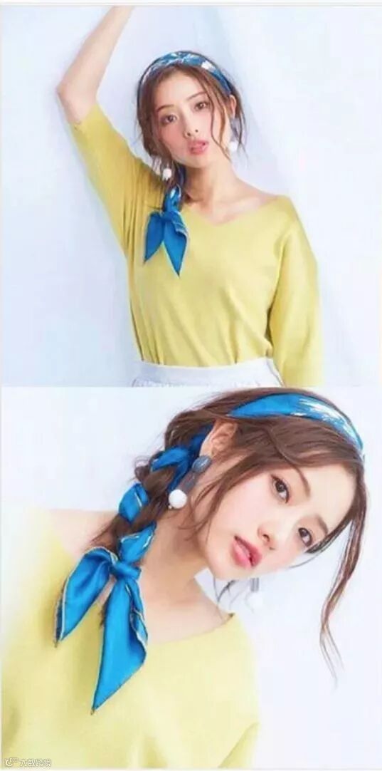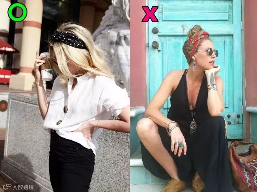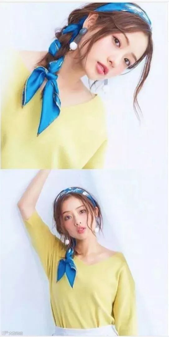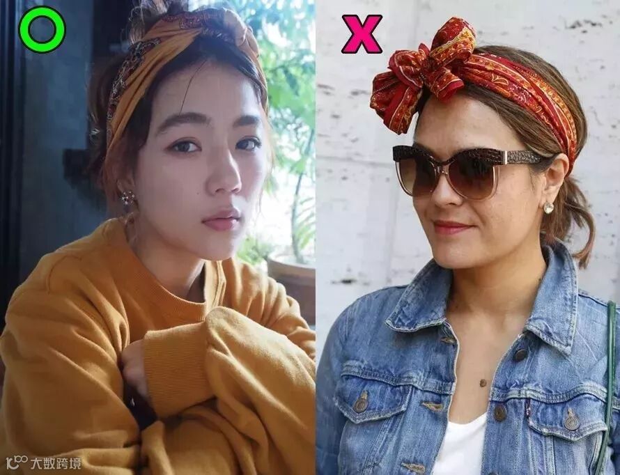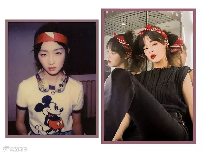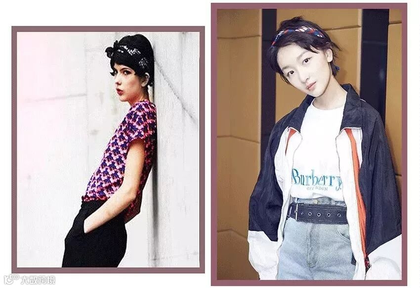 除此之外也可以用前面说过的丝巾、发带,制造比较复古嘻哈的效果。系带或戴上的方式和前面几种差不多,但宽度上要留多一点空间。至于打结的位置,其实都可以,只要记得在额前留足够的碎发or刘海,发带宽度足够就差不多了,短发、披发、高马尾、丸子头都可以。