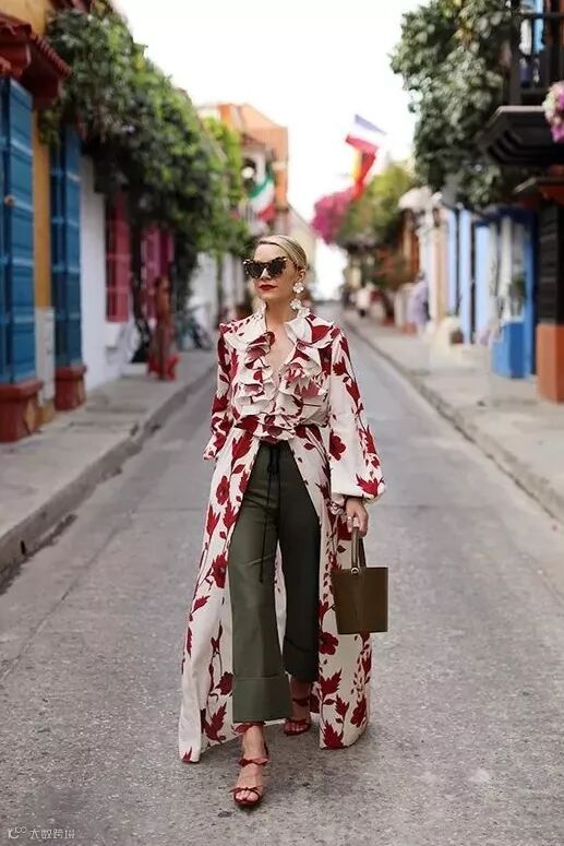 大片的印花充满了浪漫与优雅,下身选择一条素色裤,为整体造型添加硬朗气势。