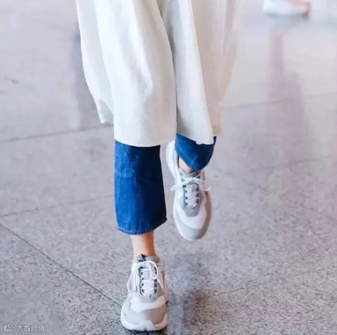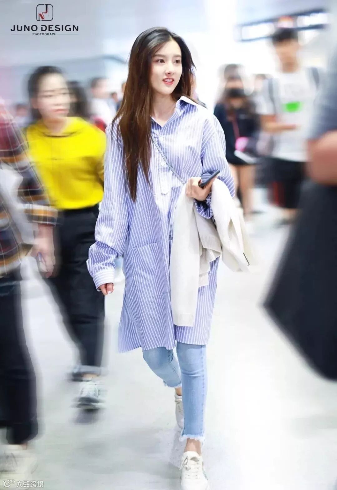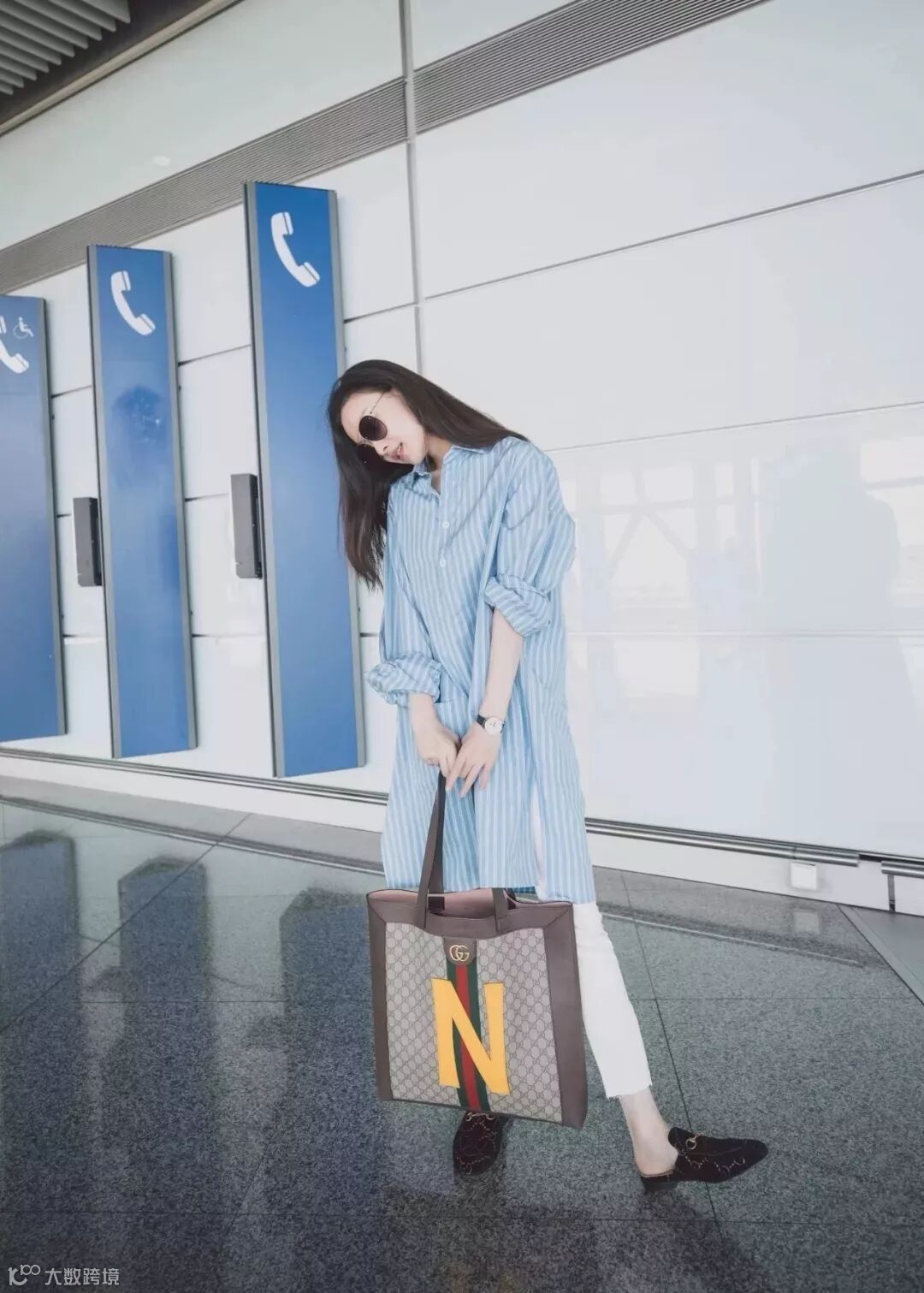 喜欢舒适风穿搭的倪妮用一件浅蓝条纹衬衫搭配小白裤,配上她最爱的乐福鞋,休闲又随性。