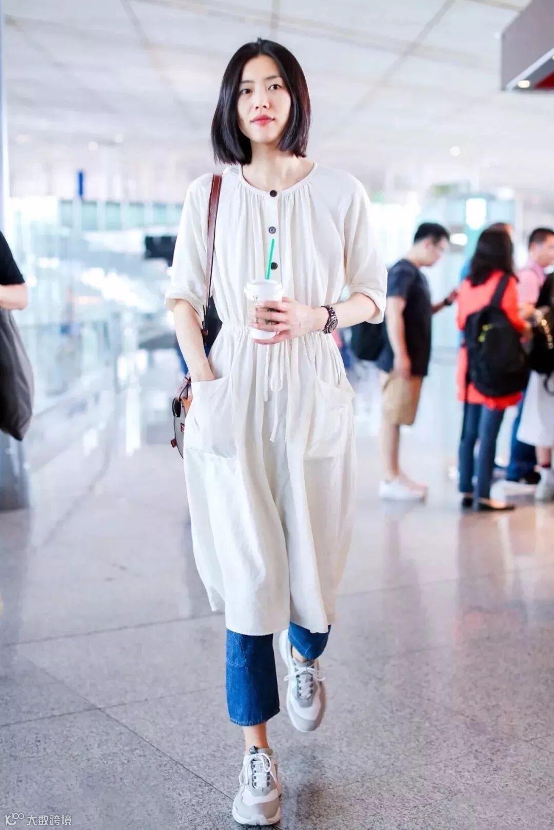 大表姐刘雯用一件连衣裙搭配牛仔裤,搭配的依然是老爹鞋,慵懒中带着一股知性女人味。