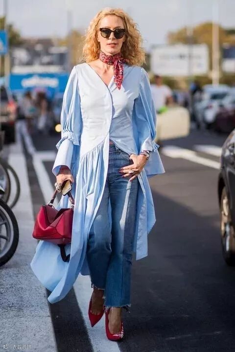 袒露的脖子可以用一条丝巾增加造型感,系丝巾的女人就是有一种让人多看几眼的魅力。