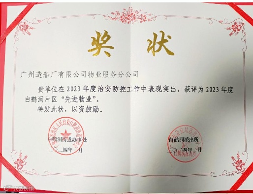 1月25日,白鹤洞街道物业小区平安建设工作会议在白鹤洞街道会议厅举办,白鹤洞街道书记吴伟辉、白鹤洞派出所所长丁耀辉出席会议。中国船舶集团广州公司物业事业部下属广州造船厂有限公司物业服务分公司在2023年度治安防控工作中表现突出,获评为白鹤洞片区“先进物业”,并现场接受表彰。