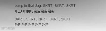 它原本是一个拟声词,模仿的是汽车在高速漂移或急转弯时橡胶轮胎与地面摩擦的声音,因此,Skr(t)在说唱歌曲中常被当作动词使用。在嘻哈字典网站therightrhymes上,skrt 可以作不及物动词,表达“急转弯”或“快速离开”的意思。