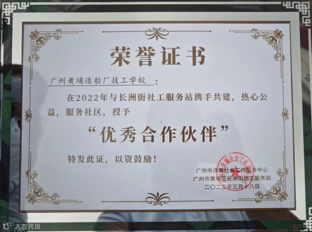 近年来通过持续在所在街道开展高品质志愿服务活动,黄船技校志愿者服务队得到了黄埔区长洲街道的认可,活动现场获颁“优秀合作伙伴”荣誉称号。
