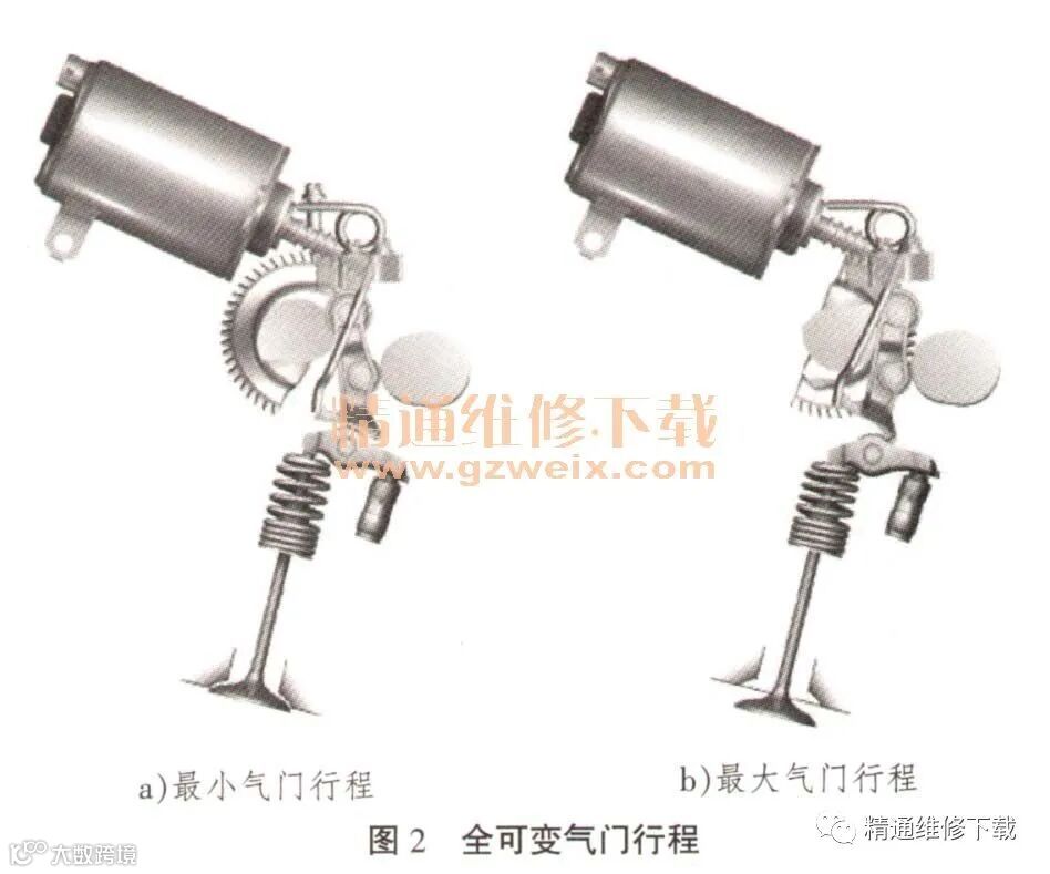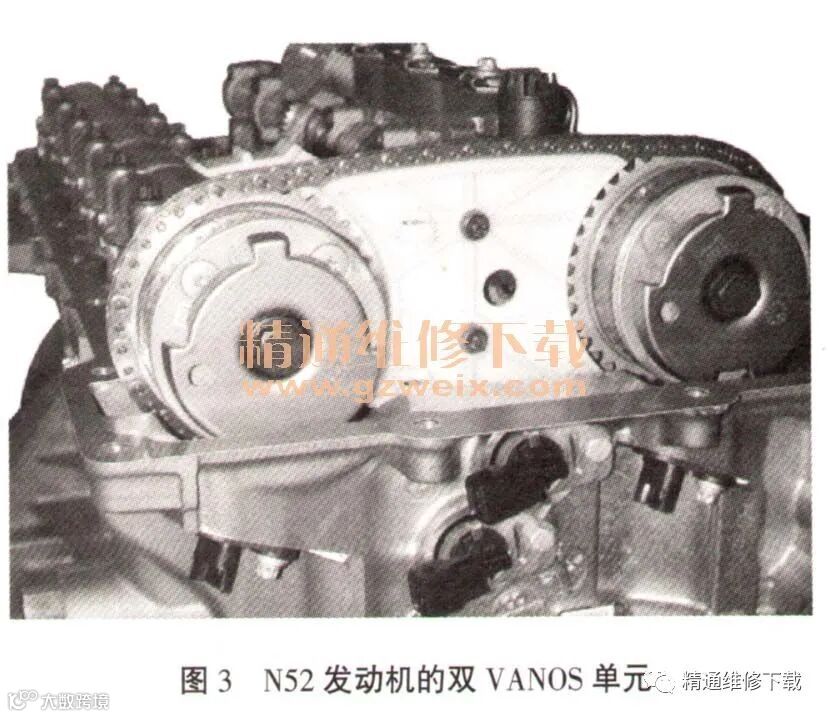 该车搭载的是BMW全新一代的N52发动机,该发动机采用了世界首创的铝镁合金复合式曲轴箱、全新换气系统VALVETRONIC II(重量经过优化的双VANOS、全可变气门机构、集成在发动机电子系统内的控制装置、3级可变进气装置)。VALVETRONIC II由全可变气门行程控制装置和可变凸轮轴控制装置(双VANO引构成(如图1所示)。在此不仅控制进气侧的气门行程,同时也能调节排气侧的凸轮轴。