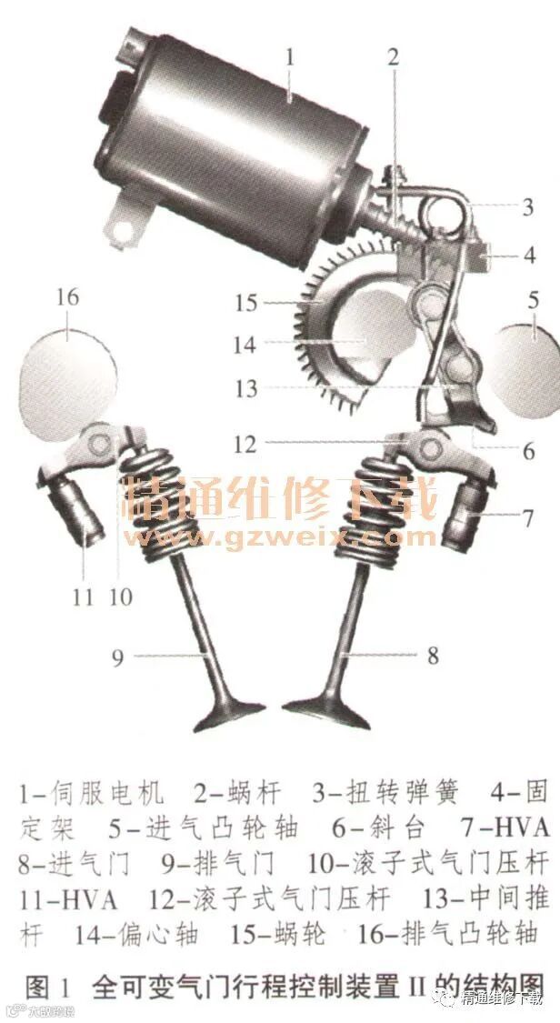 如图2所示,全可变气门行程控制通过1个伺服电机、1个偏心轴、1个中间推杆、回位弹簧、进气凸轮轴和滚子式气门摇臂实现。