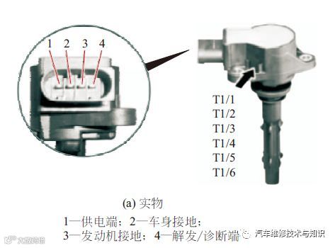 捷达轿车点火线圈采用的是无分电器双缸式点火线圈,如下图所示,插头共有4个脚,其中1脚与3脚为控制脚,分别接发动机控制单元;2脚为供电端,接12V电源;4脚为接地端,当1脚和3脚输入控制信号时,高压端头输出高压电,供4个气缸的火花塞点火。