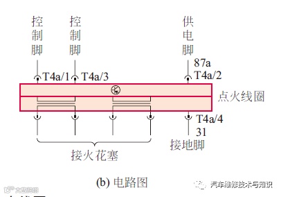 双缸式点火方式是指两个气缸合用一个点火线圈,即一个点火线圈有2个高压输出端,分别与火花塞相连,负责对2个气缸同时点火。无分电器双缸式点火线圈的工作原理如下图所示(以4缸发动机为例),内部初级绕组由两个晶体管分别控制搭铁,共用一根电源线。