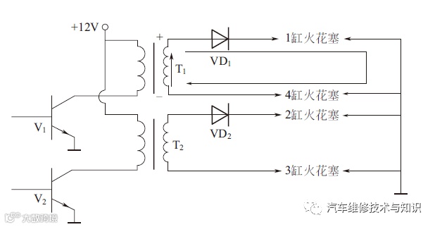 V1—1缸、4缸点火控制三极管;V2—2缸、3缸点火控制三极管;VD1—1缸、4缸高压二极管;VD2—2缸、3缸高压二极管;T1—1缸、4缸点火线圈的次级绕组;T2—2缸、3缸点火线圈的次级绕组