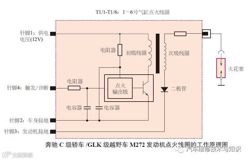 独立式点火是指每一个气缸分配一个点火线圈,即点火线圈和输出放大器集成在一个部件上,点火线圈直接安装在火花塞的顶上。奔驰C级轿车/GLK级越野车M272发动机使用带点火输出端的独立式点火线圈,点火线圈实物及安装位置如下图所示。点火线圈的1端子为供电端,2端子为车身接地,3端子为发动机接地,4端子为触发/诊断端。