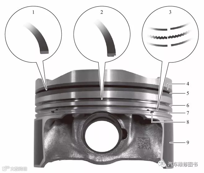 1—矩形环;2—鼻形锥面环;3—VF系统环;4—第一活塞环钢制环岸;5—第一活塞环槽;6—第二活塞环槽;7—刮油环槽;8—润滑油排出孔;9—石墨涂层