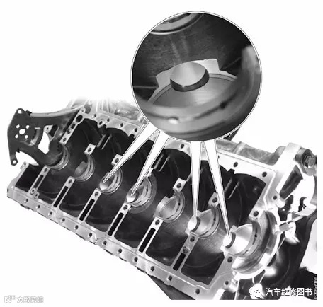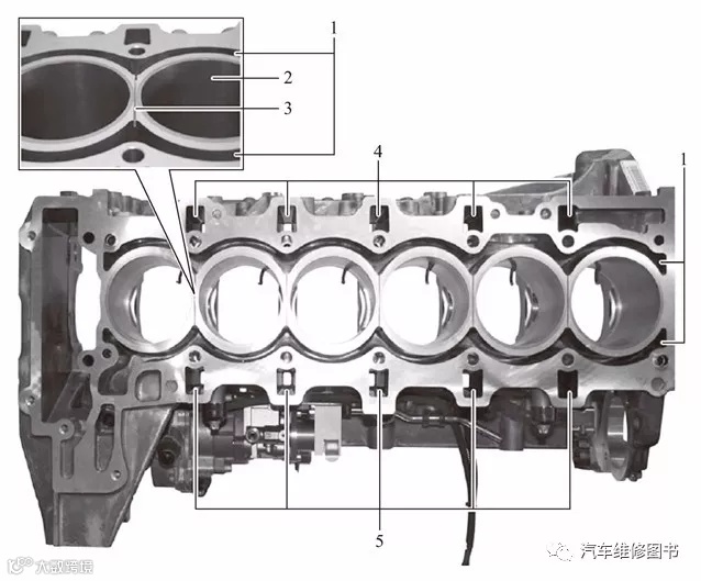 曲轴箱带有注入式铸铁气缸套2;两个气缸之间的凸台增加了一个凹槽3;冷却液可以通过这些凹槽从曲轴箱一侧流向另一侧,从而冷却这些凸台。与N54发动机相比,在排气侧的五个机油回流通道4用于机油从气缸盖回流到油底壳内。这些机油回流通道继续引入底板内至导流板下。因为即使横向加速度较大时回流的发动机油也无法到达曲轴传动机构处,所以这些通道有助于减少渗入损失。进气侧也有五个机油回流通道5用于泄漏气体无阻碍地从曲轴箱流至气缸盖内和气缸盖内的曲轴箱通风装置。发动机缸体内的冷却通道1分为两个部分,冷却液直接流过该通道。
