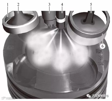1—排气门气门座;2—排气门;3—火花塞;4—喷射器;5—进气门;6—进气门气门座