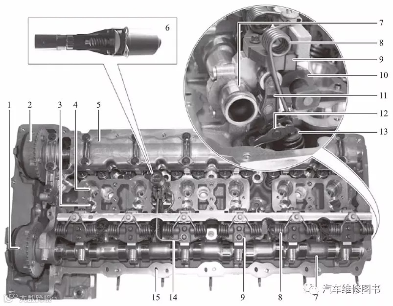 1—进气凸轮轴VANOS调节单元;2—排气凸轮轴VANOS调节单元;3—喷射器安装孔;4—火花塞安装孔;5—凸轮轴壳体;6—Valvetronic伺服电动机;7—进气凸轮轴;8—扭转弹簧;9—月牙板;10—偏心轴;11—中间推杆;12—滚子式气门摇臂;13—气门头;14—机油喷嘴;15—泄漏气体引入孔