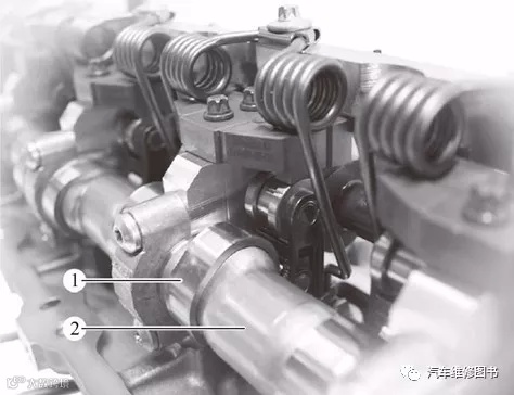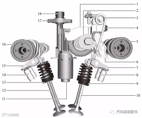 1—机油喷嘴;2—偏心轴;3—扭转弹簧;4—月牙板;5—进气凸轮轴;6—中间推杆;7—滚子式气门摇臂;8—液压气门间隙补偿装置;9—气门弹簧;10—进气门;11—Valvetronic伺服电机;12—排气门;13—气门弹簧;14—液压气门间隙补偿装置;15—滚子式气门摇臂;16—排气凸轮轴;17—密封套管;18—插孔