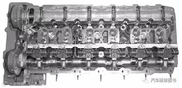 该凸轮轴传动装置与N54发动机的凸轮轴传动装置相同。下图所示为N55发动机气缸盖及ValvetronicⅢ和直接喷射装置组合的结构。