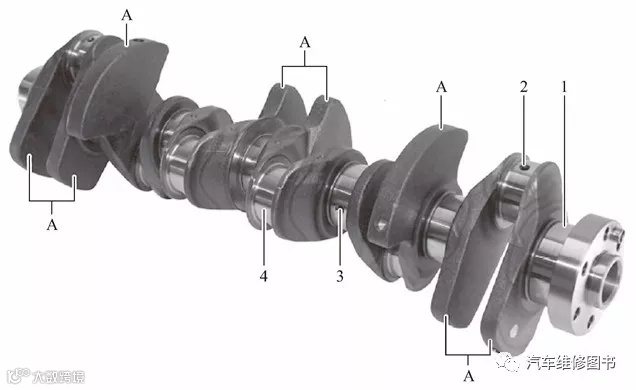 A—平衡重;1—主轴颈7;2—从连杆轴承至主轴承的机油孔;3—从主轴承至连杆轴承的机油孔;4—气缸4连杆轴颈