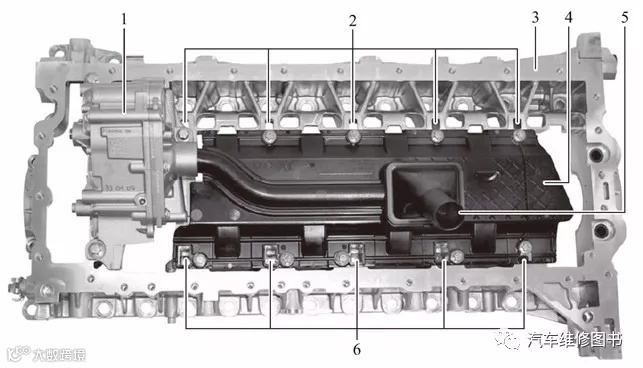 1—机油泵;2—进气侧机油回流通道;3—底板;4—导流板;5—带有机油滤网的抽吸管;6—排气侧机油回流通道
