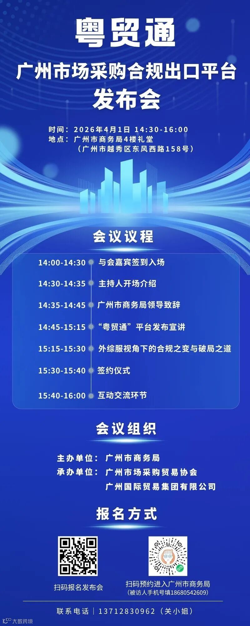 为全面推介平台功能,凝聚行业共识,启动全市推广,现广州国际贸易集团有限公司联合广州市场采购贸易协会定于2026年4月1日(星期三)下午14:00在广州市商务局4楼礼堂(地址:广州市越秀区东风西路158号广州国际经贸大厦)举办发布会,向业内各方详细介绍“粤贸通”平台。