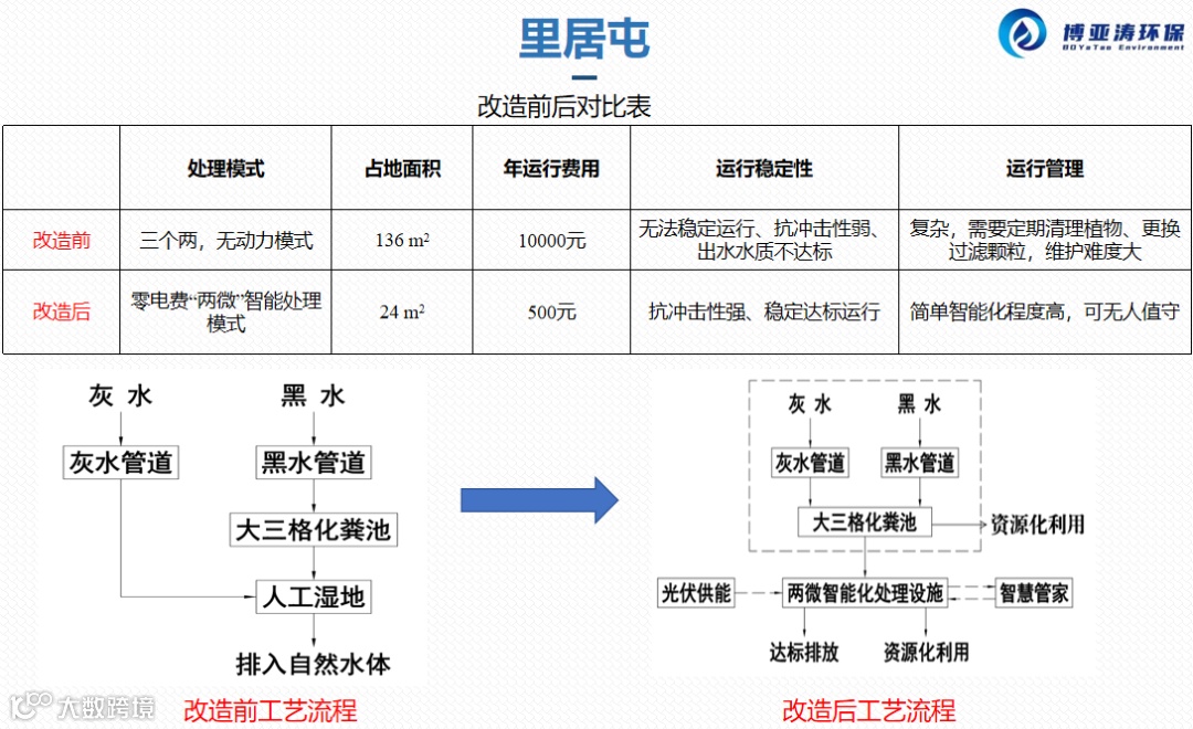 这一模式使运行成本降低了90%,年运行成本由1万元降至500元;占地面积降低了80%,由150平方降低至20-30平方,并且污水处理稳定达到农村污水一级标准。