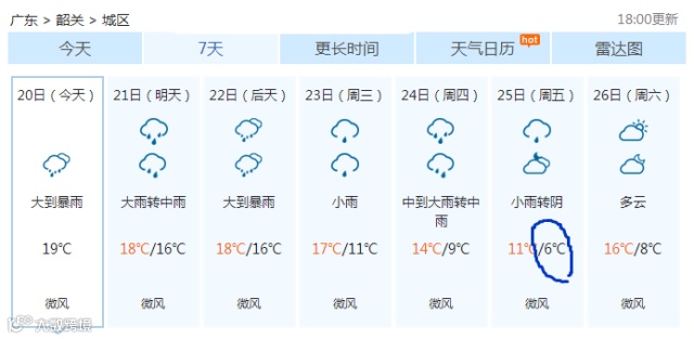 北部的韶关,最低只有6℃...